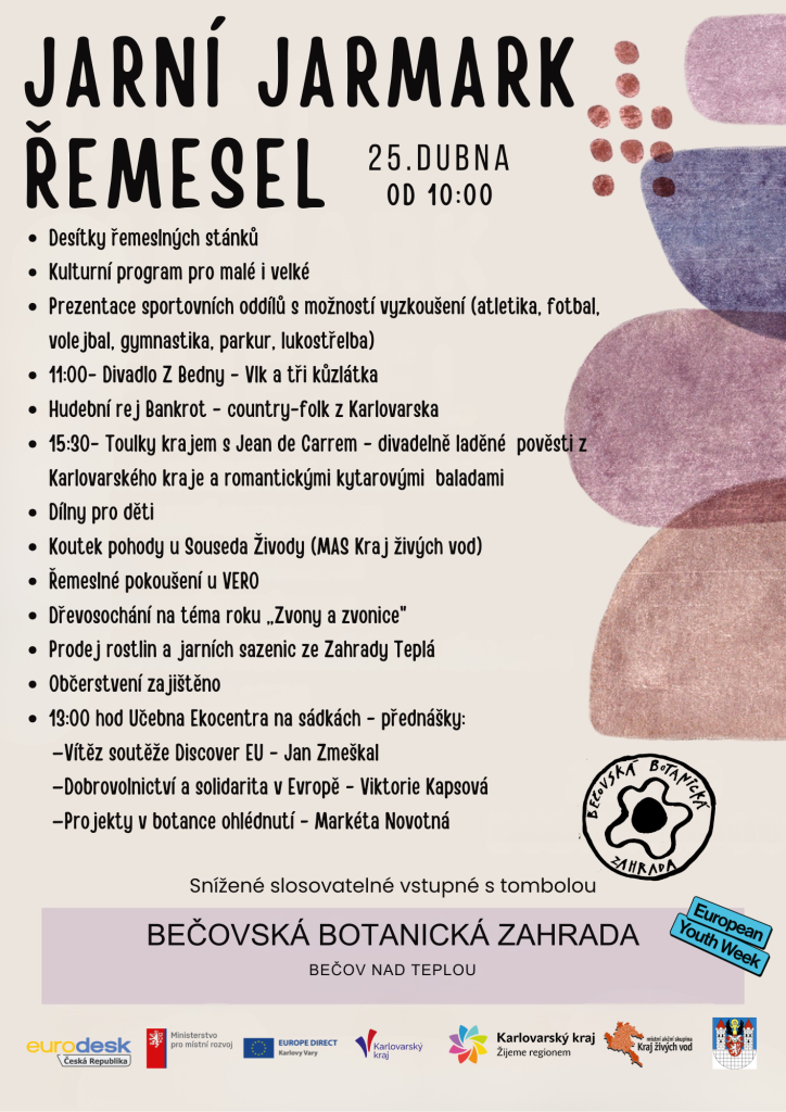 Jarní jarmark řemesel se uskuteční 25. dubna 2026 v Bečovské botanické zahradě od 10:00 do 17:00. Můžete se těšit na desítky řemeslných stánků, kulturní program pro všechny věkové kategorie a prezentace sportovních oddílů, kde si budete moci vyzkoušet různé sporty, jako je atletika, fotbal, volejbal